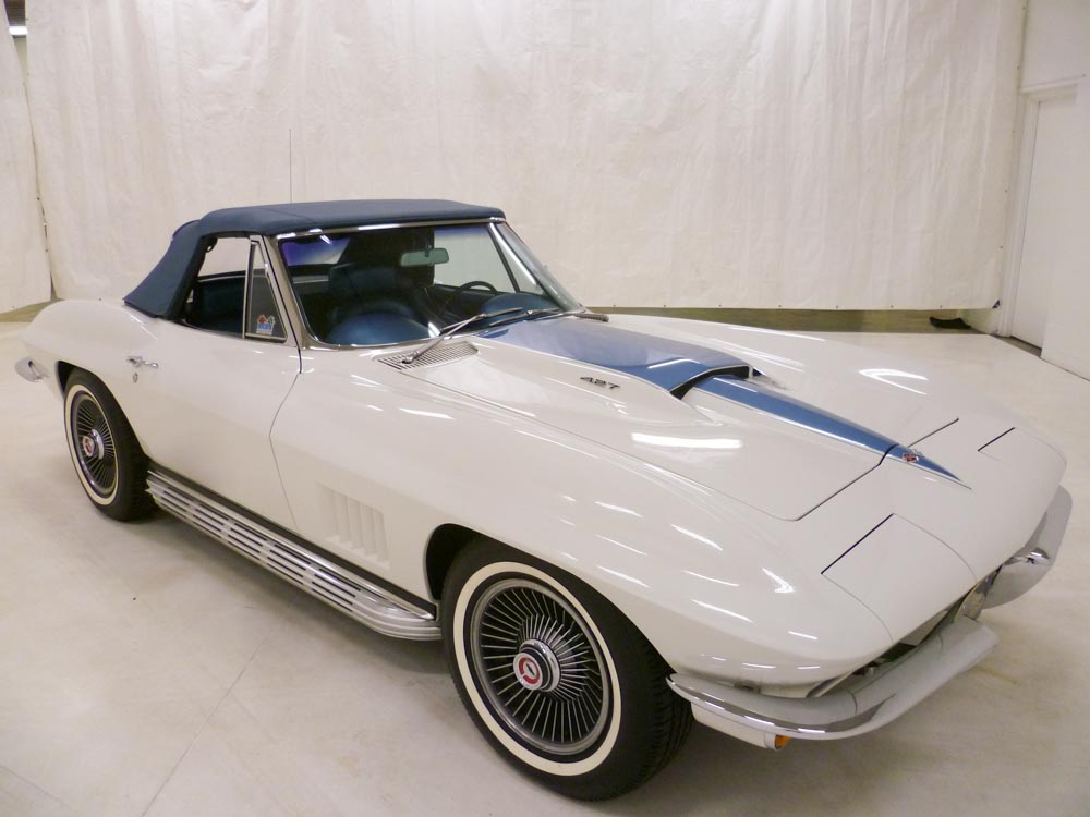 1018U..1967 Corvette Convertible with Two Tops, 427-435 hp, 4 speed, numbers matching original motor, transmission and rear end, also has factory original body/trim tag. Ermine White paint with Bright Blue stinger, Bright Blue interior, and Blue soft top. Rare documented color combination that has been body-off restored and subsequently shown earning the Bloomington Gold certification and multiple NCRS Top Flight awards. NO HIT GM front end with grill tab in place. Paint has aged gracefully but has some checking. The standard bore motor was also rebuilt during restoration. Also has an affirmation by CCAS/Grenning as to the legitimacy and originality of the engine block, stamp pad, and the engine stamp. Optioned with factory side exhaust (born with), headrest seats, transistorized ignition, auxiliary hardtop, M-21, 4.11 posi, SS brakes, AM/FM radio, tinted windshield, Kelsey B.O. aluminum wheels and your choice of 7.75x15" vintage red stripe tires or modern white stripe radials. Most all factory correct type components including the spare, jack, jack tools, clear floor mats, seat belts, washer system, shifter, shielding, braided wires, air cleaner, alternator, distributor, hoses, hose clamps, carbs, starter, valve covers, radiator, five Kelsey B.O. aluminum wheels, gas door assembly, glove box door, owners manual, sales brochure, and T-3 headlights. Documented with the NCRS/GM validated tank sticker, CCAS/Grenning Engine Stamp Affirmation, warranty book/P.O.P., restoration photos/receipts, Bloomington and NCRS judging sheets, NCRS Confirmation of Judging Awards, owners manual packet and multiple 3-ring binders. Also has extensive owner history including John Danos, George Page and Michael Seskin. Just in from the past owner of 25-years. Production date of May 15th, 1967 and delivered new by Rosenthal Chevrolet in Arlington, VA (dealer code 475 in Zone 14) per the official NCRS/GM Shipping Data Records (SDR). Looks, runs, and drives excellent. CC:+2 Consigned to Mecum Kissimmee Collector Car Auction January 15th - 17th, 2026