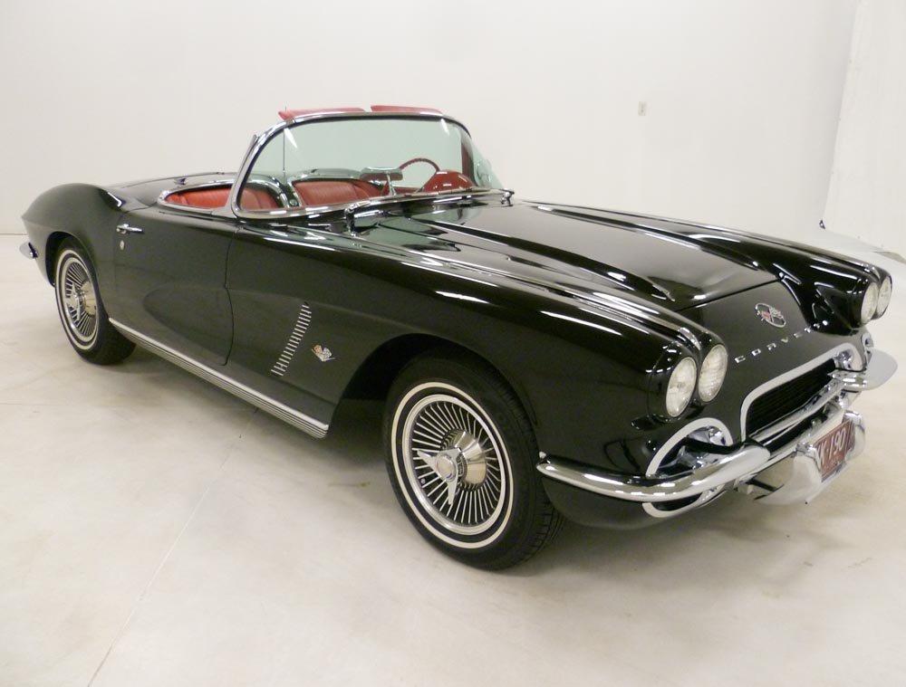 1001R..1962 Corvette Convertible, two tops, 327-360 hp, fuel injected, 4 speed, numbers matching motor, transmission and rear end. Sateen Silver paint with Roman Red interior and Black soft top. The Silver/Red paint-interior combination was very rare on early 1957 to 1967 Corvettes and is quite desirable in today's modern world. Body-off restoration in show condition with multiple NCRS Top Flights (97.8% and 98.7%) in 2004 and 2022. These type restorations normally cost between $100,000.00 to $150,000.00. Also invited for display at the 2015 NCRS Gallery XV and editorialized in the Corvette Enthusiast magazine in a 4-page spread. Optioned with power windows, auxiliary hardtop, T-10 transmission, posi, Wonderbar radio, fuel injection, off road exhaust, sunvisors, windshield washers, courtesy light, heater, hubcaps, and white stripe tires. Most all factory correct type components including the spare, jack, jack tools, trunk mat, trunk liner, taillight cones, rebound straps, seat belts, washer system, shifter, shielding, air cleaner, #2268 generator, distributor, spark plug shields, hoses, hose clamps, hardtop wrench, F.I. unit, F.I. fuel filter, starter, finned balancer, GM exhaust, expansion tank, radiator, guide Y-50 mirror, owners manual, sales brochure, and T-3 headlights. Documented with the NCRS certificate, NCRS judging sheets, NCRS ribbons, NCRS Gallery invitation, ACI certificate, Corvette Enthusiast magazine, owners manual packet, copies of old titles and 5 owner history back to Conner Chevrolet and the first owner in Roanoke, IN. This car has been recognized as an ACI certified medallion level collectible vehicle in November 2020. Looks, runs, and drives excellent. CC:1 $169,000.00