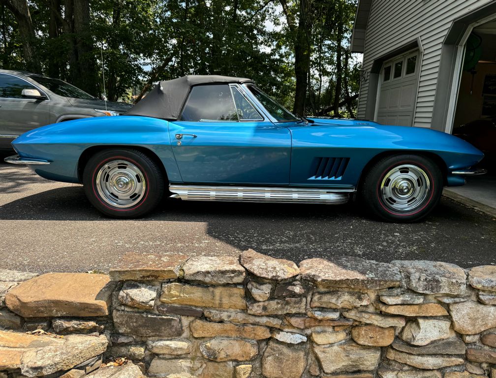 1007Q..1967 Corvette Convertible, two tops, 427-400 hp, 4 speed, numbers matching original motor, transmission, rear end, VIN tag and trim tag. One owner until 2009 when we bought this car with 60,951 actual miles. Marina Blue paint with Black stinger, Bright Blue interior and Blue soft top. Original, unrestored survivor with original paint, interior, soft top, body, and tank sticker which is still on the original gas tank which is out of the car; yes it has a replacement gas tank. These original unmolested cars are among the rarest of rare and are rising to the top of the Corvette food chain as unrestored cars are used as guideposts for restorers, shining a light on the way vehicles were originally built and represent the standards which historians, judges, and future restorers can use to determine factory authenticity. The solid feel of an excellent unrestored car cannot be overstated! Also has an affirmation by CCAS/Grenning as to the legitimacy and originality of the engine block, stamp pad, and the engine stamp. Very rare 400 hp hydraulic motor 1967 and 1 of only 2,101 produced but what is super rare is that it is a documented triple blue Corvette with a blue soft top and hardtop! Optioned with auxiliary hardtop, M-21, 3.70 posi, AM/FM radio, tri-power, tinted glass, rally wheels and 7.75x15" white stripe tires. Most all factory correct type components including the spare, jack, clear floor mats, seat belts, washer system, shifter, shielding, braided wires, air cleaner, alternator, hoses, hose clamps, window glass, valve covers, carbs except one, radiator, gas door assembly, glove box door, owners manual, sales brochure, and T-3 headlights. Documented with the tank sticker, May 1967 title, dealer invoice, installment sales contract, owner history, owners manual packet, CCAS/Grenning Engine Stamp Affirmation, service log book, oil change stickers, maintenance receipts from the 1970's, registrations, insurance I.D. cards, old barn find photos prior to cleaning all organized in a huge 3-ring binder. Production date of April 14th, 1967 and delivered new by Dippel Brothers Motor Co. in Archbald, PA (dealer code 131 in zone 49) per the official NCRS/GM shipping data records (SDR). From the past original owner of 42 years. This Corvette has yet to be shown, creating an exciting opportunity for the next owner to exhibit the car and compete for trophies, awards, and recognition! $149,000.00