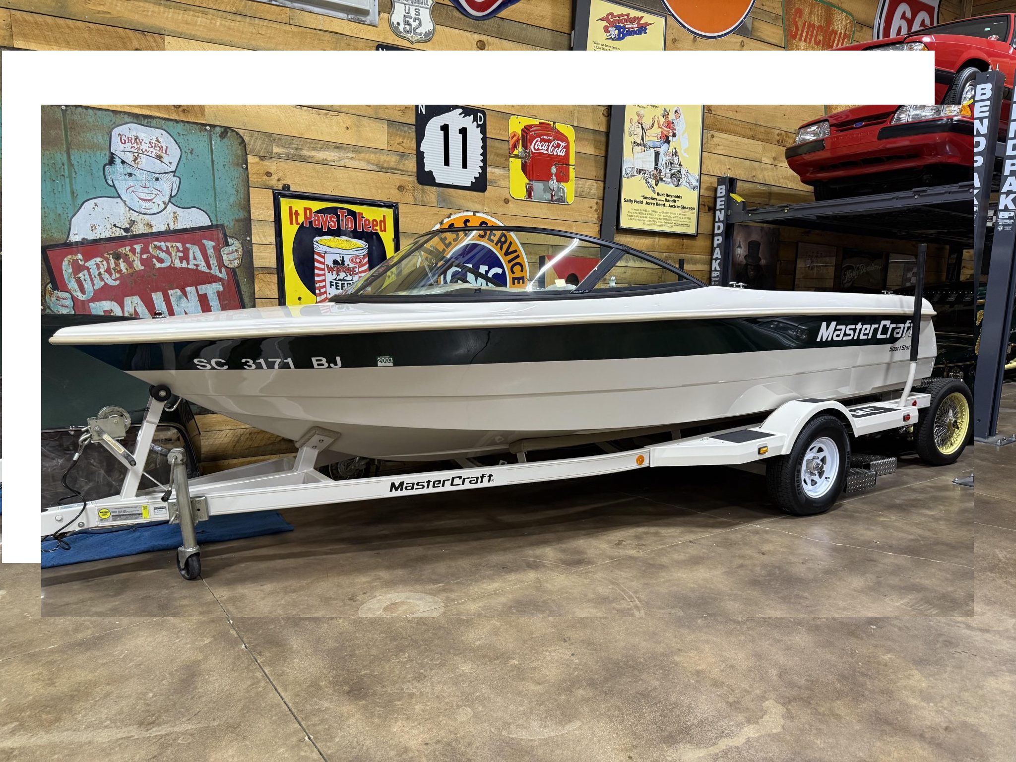 The Mastercraft single-axle trailer is finished in white and equipped with a rolling tongue jack, hand winch, fender step plates, carpeted bunks and trailer lighting.